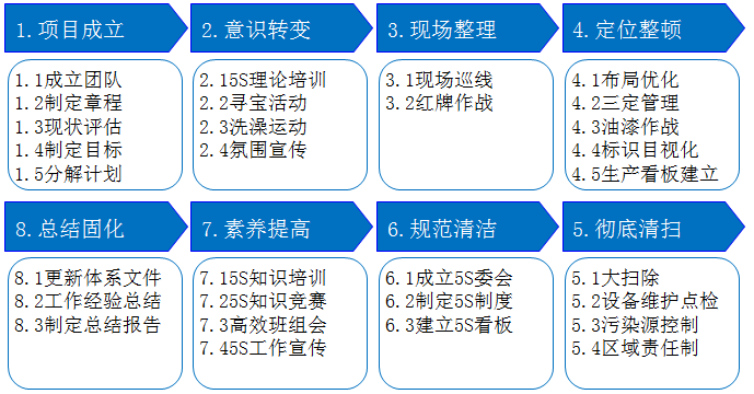 伟弘贝格数据库拥有众多行业目视化手册,包含通信、家电、汽车、食品、家具、化工、机械等,结合我们总结的5S推行方法论(如下),可以帮助企业缩短导入周期、减少效果反弹