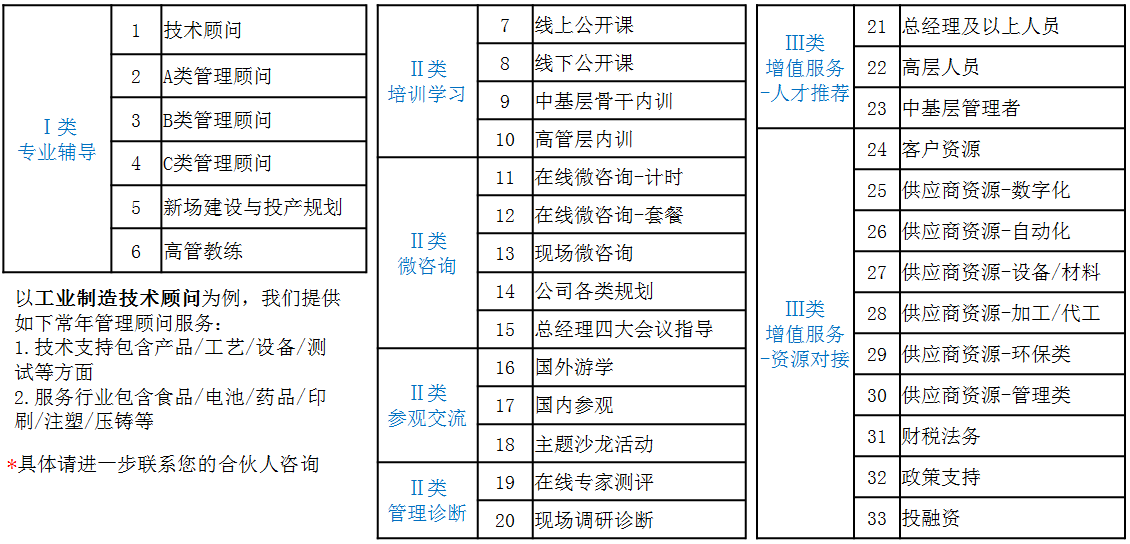 以工业制造技术顾问为例,我们提供如下常年管理顾问服务: