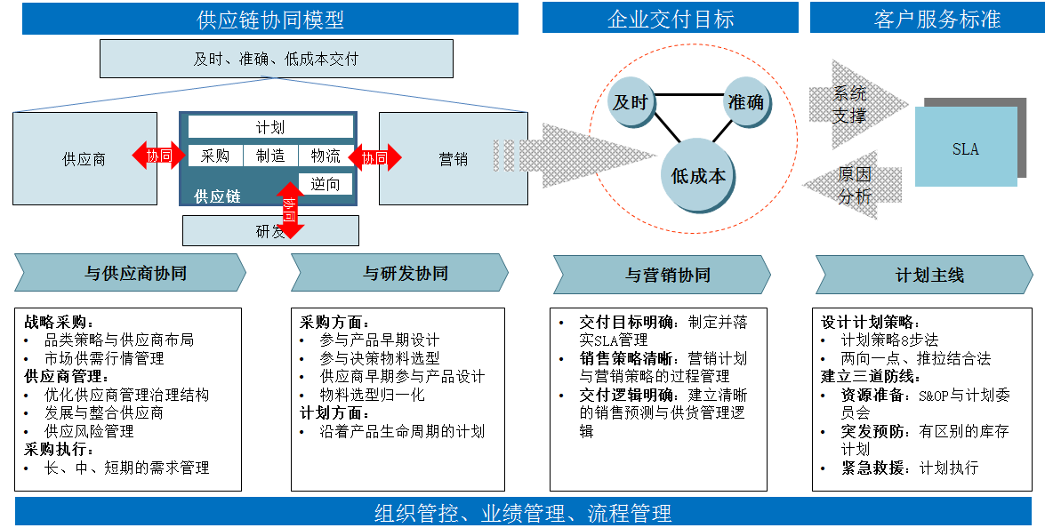 准时交付率提升是一个综合性课题,但不少企业却采取比较片面的改进方法,因此效果自然有限并且反弹。伟弘贝格建议采用一体化的整体思想,即以SLA为指导,计划为主线,三方协同(与供应商、研发、营销协同),组织管控、业绩管理、流程管理为后盾。数百家企业采用此方法论而从中收益